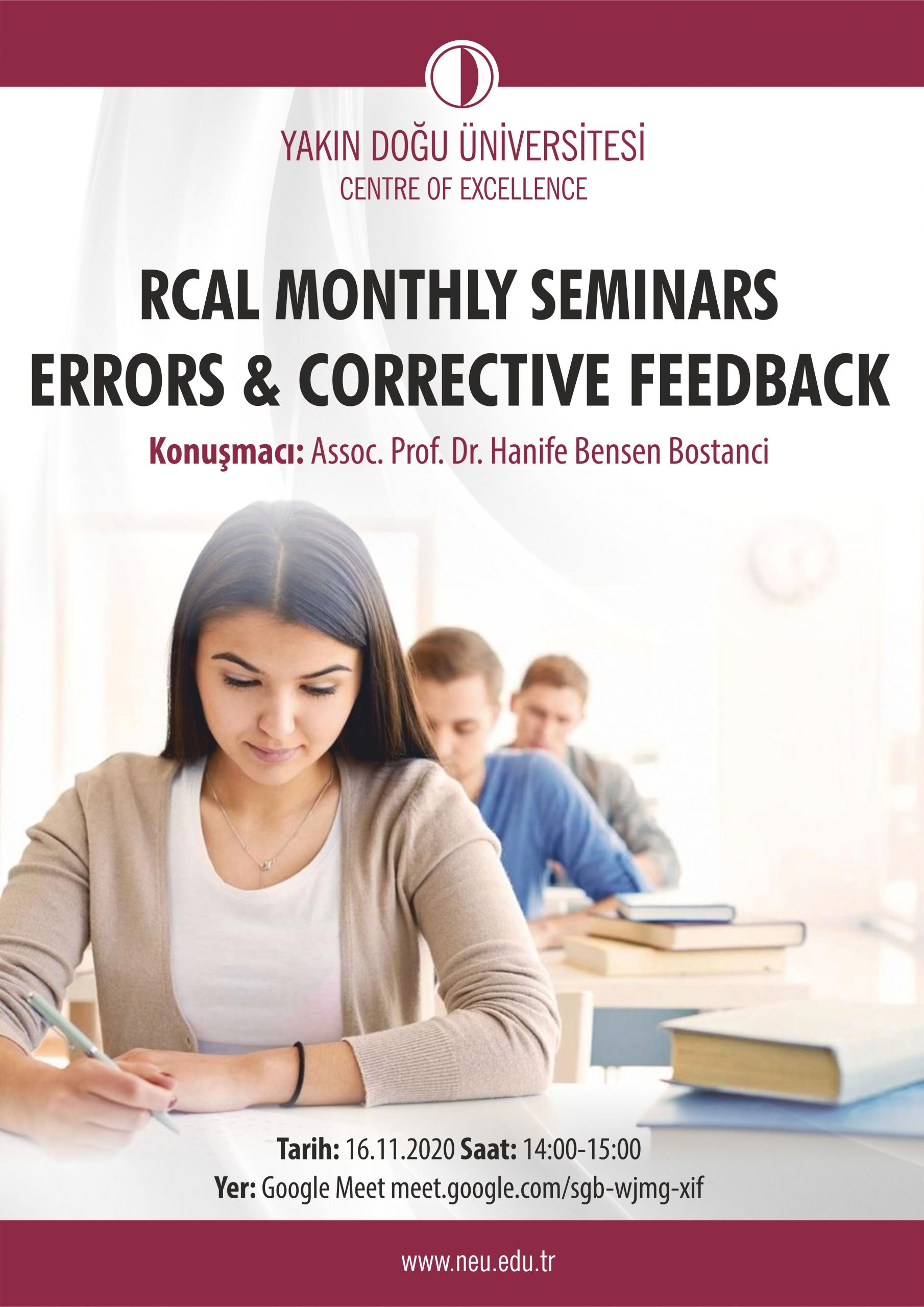 Montly RCAL Seminars start with "Errors and Corrective Feedback" by Assoc. Prof. Dr. Hanife Bensen Bostancı in November! Please join us through Google Meet: